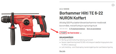 Alle verktøyene vi tilbyr gjennom Motek Fleet Management er merket med «Fleet» i nettbutikken vår. Du velger selv hvilke verktøy du trenger fra Hilti, Festool og Bostitch.