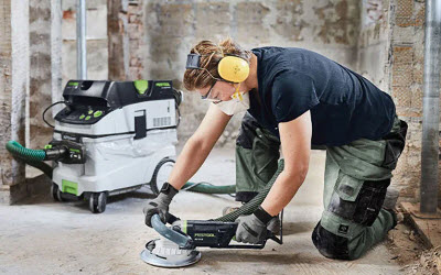 Motstandsdyktige gamle gulv og støvskyer hører fortiden til. Med verktøy fra Festool, som er utviklet etter de nøyaktige kravene til gulvleggere, kan du håndtere daglig arbeid enda raskere og enklere. Betongsliperen RENOFIX RG 130 imponerer i kombinasjon med CTM 36 AC støvsuger og andre verktøy for flisleggere og parkettleggere i Festool-systemet.