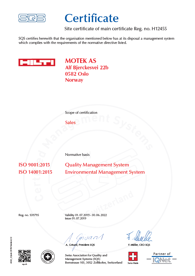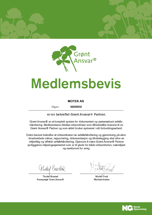Motek AS er både kvalitetssertifisert og miljøsertifisert i henhold til internasjonalt anerkjente ISO standarder ISO-9001:2015 og ISO 14001:2015