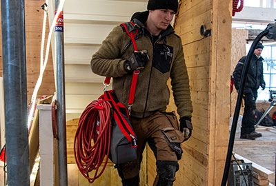 - Utvendige remmer og lommer til ekstrautstyr som spiker, luftslanger og vernebriller.