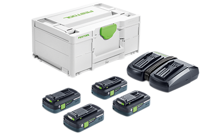 I kombinasjon med fire batterier og den nye TCL 6 DUO-laderen får du gjort jobben uten avbrudd. I de nye energisettene til Festool er batteriene og en duolader praktisk pakket i en Systainer³ slik at du enkelt får med deg batterisettet du trenger. Du kan velge mellom forhåndskonfigurerte sett eller sette sammen slik du ønsker selv.