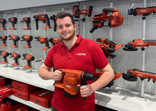 Butikken er delt inn i egne avdelinger for Festool (ref. bildet), Hilti, Bostitch samt Motek sin egen merkevare hovedsaklig på festemidler og kjemiprodukter.